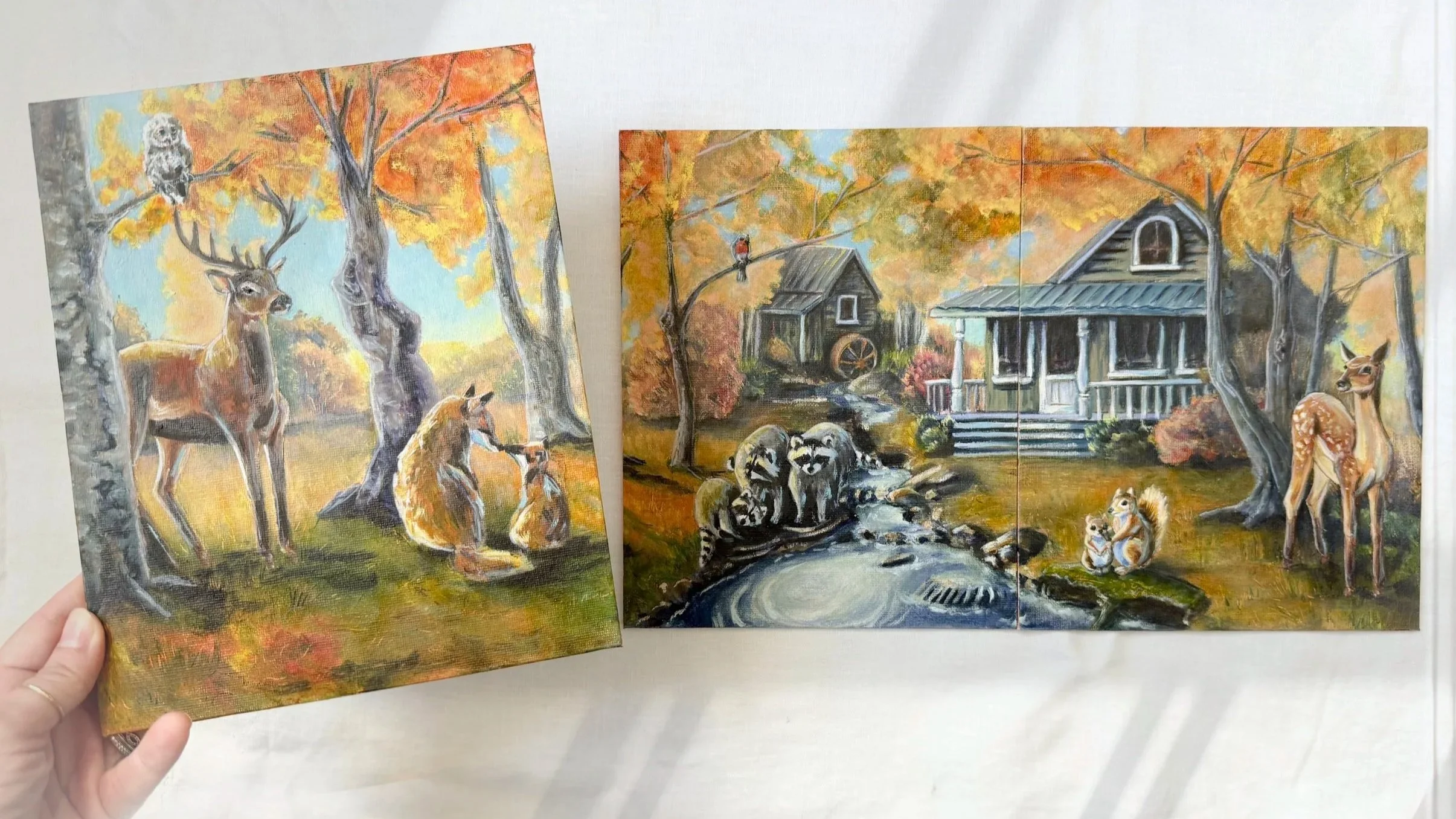 Autumn 25 is a triptych of three original oil paintings that capture the heart of the season in a rich woodland tableau. Each piece can stand beautifully on its own, yet together they form one continuous autumn scene, a forest alive with foxes, deer, an owl, squirrels, raccoons, and a bright eyed robin, all gathering near a cozy woodland cottage. Painted in warm, glowing tones of russet, gold, and deep forest green, this collection embodies the magic of fall and the quiet joy of creatures preparing for the colder months ahead. Perfect for autumncore and cottagecore homes, Autumn 25 will be released on the autumn equinox, September 22, 2025, inviting collectors to bring the enchantment of the season indoors.