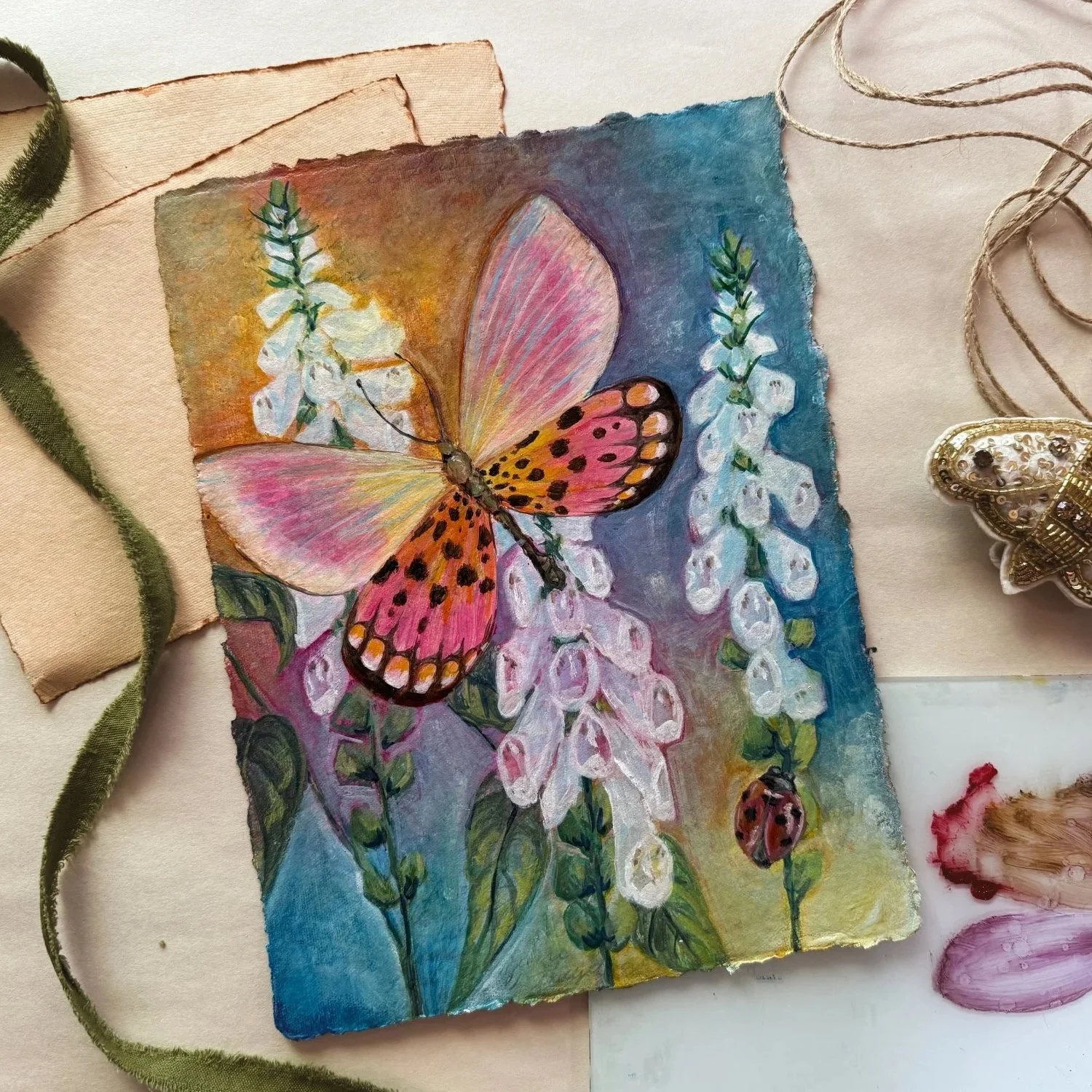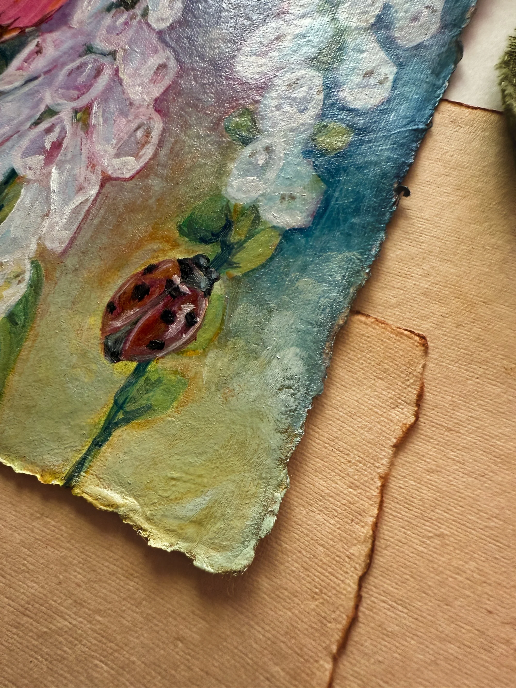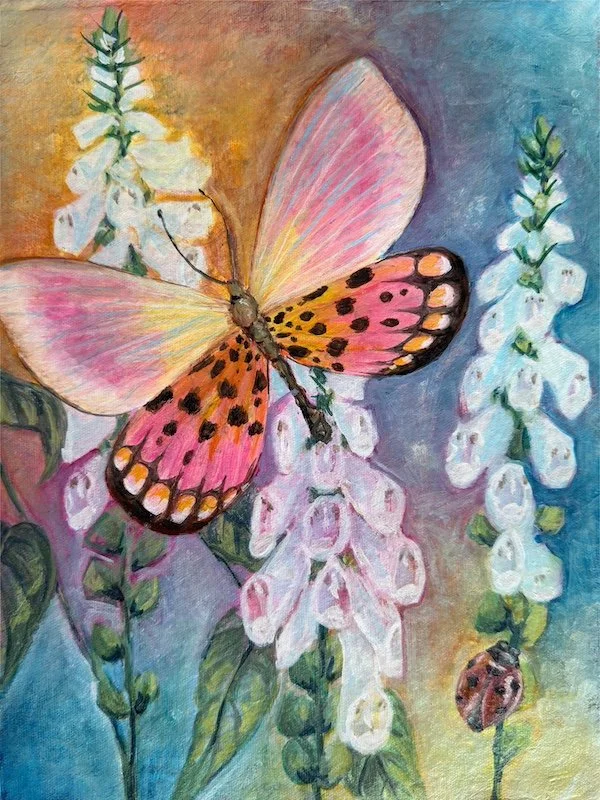 Inspired by the shifting magic of the garden from dawn to dusk, these works celebrate the quiet beauty of butterflies, bees, ladybugs, and lush blooming botanicals. Daylight captures a moment of sunlit stillness. Delicate white foxglove standing tall as tiny pollinators drift in and out of its blossoms. Enchanted invites you into a twilight garden, where datura unfurls beneath the fading light and humming bees linger in the dusk air. Painted intuitively with layered detail, these works weave together natural abundance with a touch of wonder. Collectors who love richly botanical, maximalist interiors will find these two paintings resonate as companion pieces, balancing light and shadow, day and night, in harmonious storytelling.