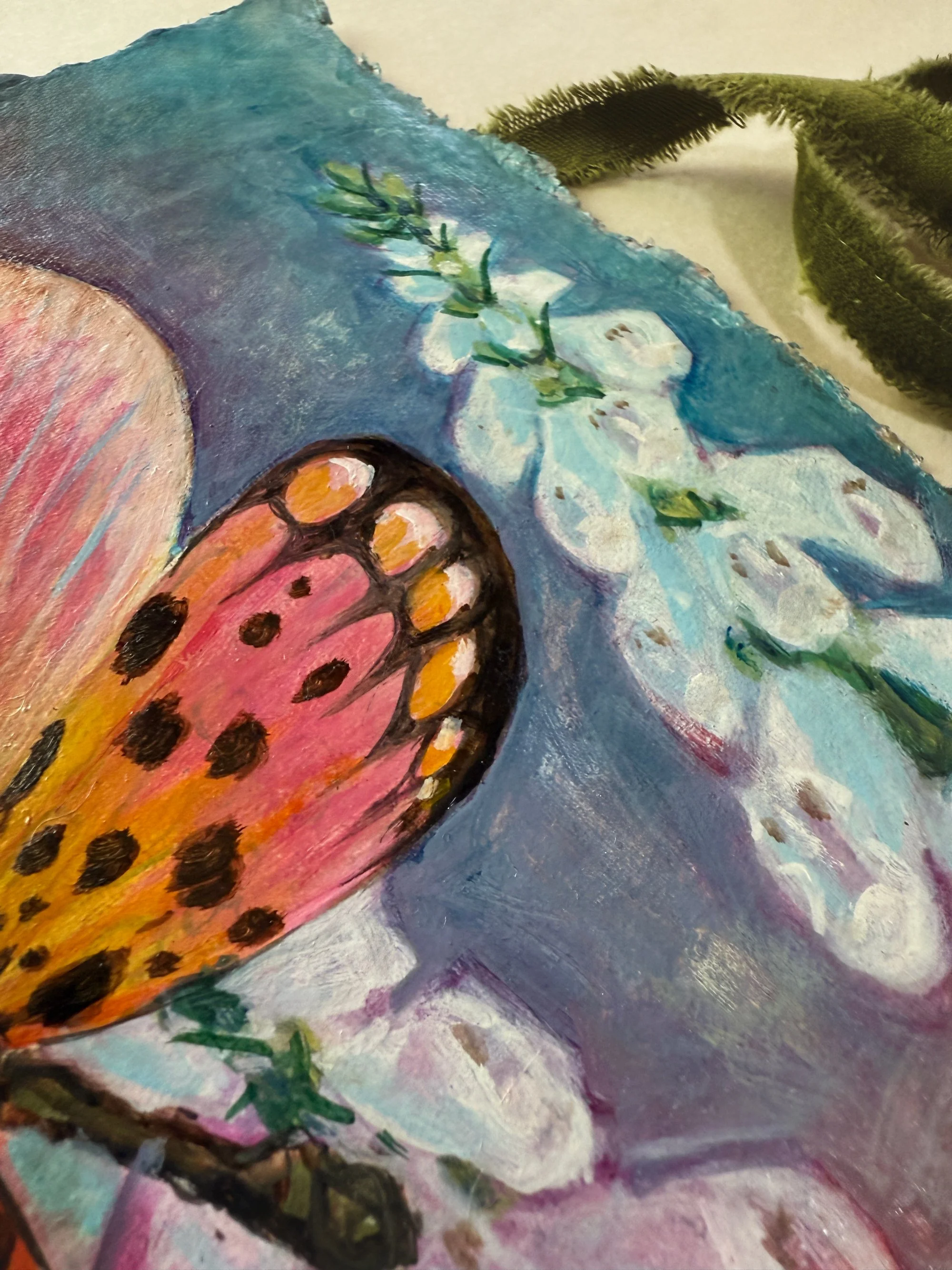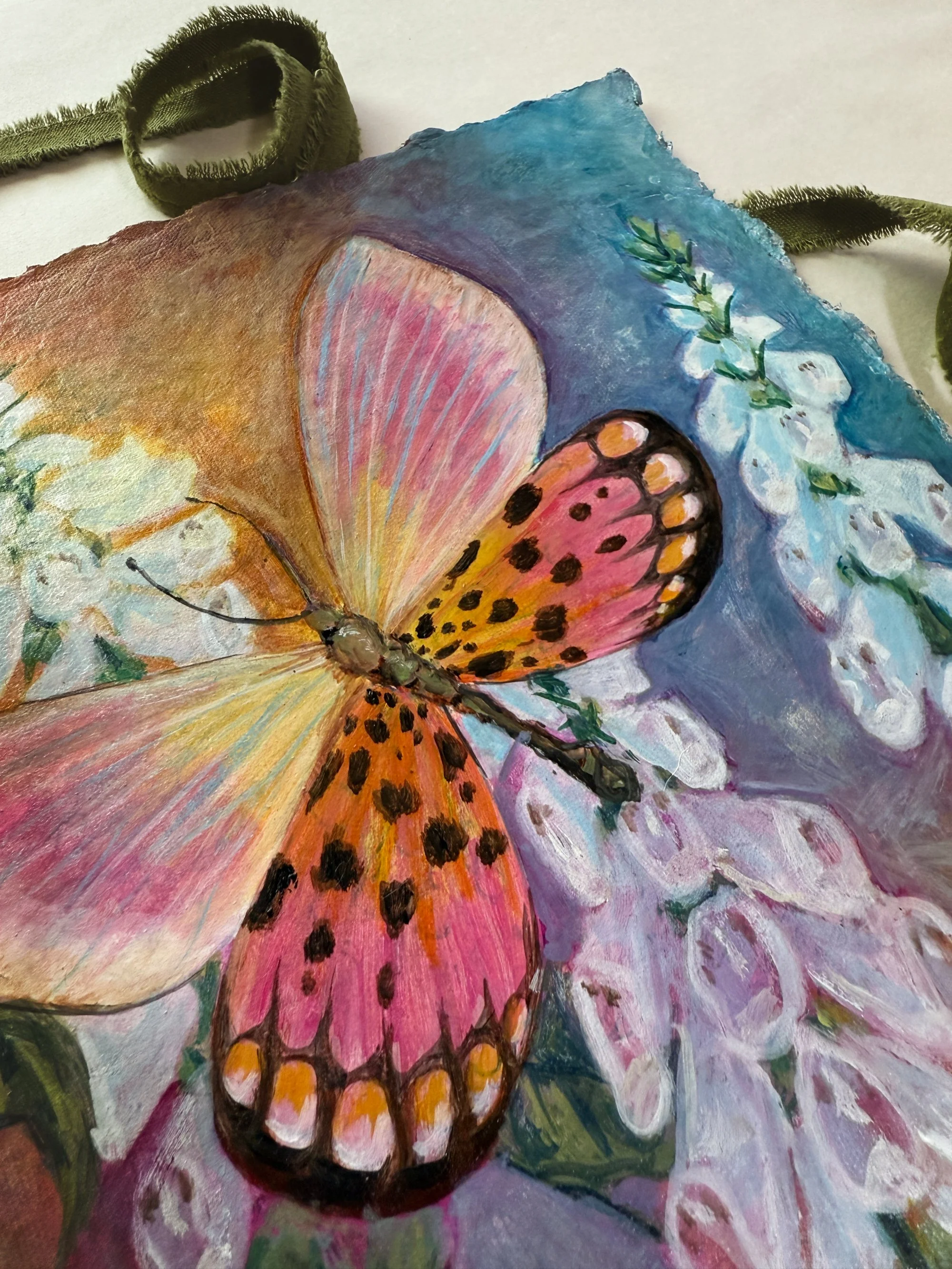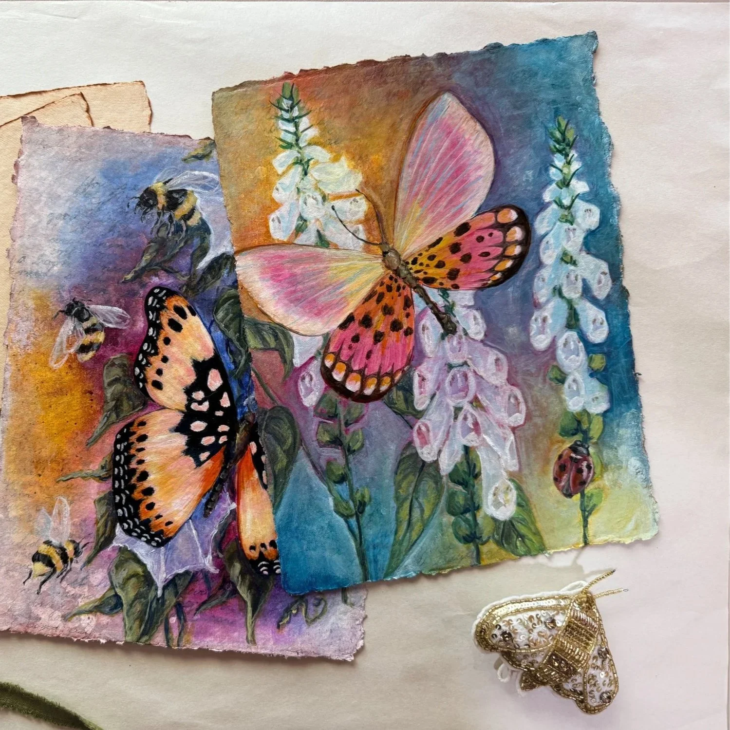 Inspired by the shifting magic of the garden from dawn to dusk, these works celebrate the quiet beauty of butterflies, bees, ladybugs, and lush blooming botanicals. Daylight captures a moment of sunlit stillness. Delicate white foxglove standing tall as tiny pollinators drift in and out of its blossoms. Enchanted invites you into a twilight garden, where datura unfurls beneath the fading light and humming bees linger in the dusk air. Painted intuitively with layered detail, these works weave together natural abundance with a touch of wonder. Collectors who love richly botanical, maximalist interiors will find these two paintings resonate as companion pieces, balancing light and shadow, day and night, in harmonious storytelling.